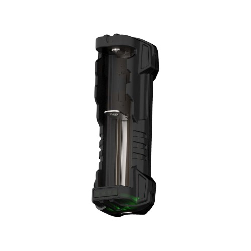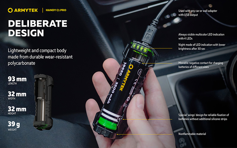 Conçu pour la portabilité, le Handy C1 Pro est fabriqué en polycarbonate durable, ininflammable et résistant à l'usure et bénéficie d'un design compact et léger avec seulement 39 grammes. Son contact négatif mobile permet la charge de batteries de différentes tailles, tandis que son design spécial avec ailettes assure une fixation fiable sans bandes silicone additionnelles.