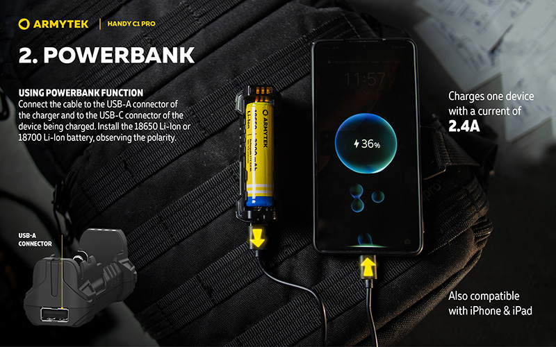 Rechargeable via port USB-C avec possibilité d'utiliser des adaptateurs muraux et voiture avec sortie USB, le Handy C1 Pro est l'accessoire idéal pour les utilisateurs de lampes, appareils électroniques et professionnels exigeant un chargeur universel fiable et une fonction Powerbank illimitée.