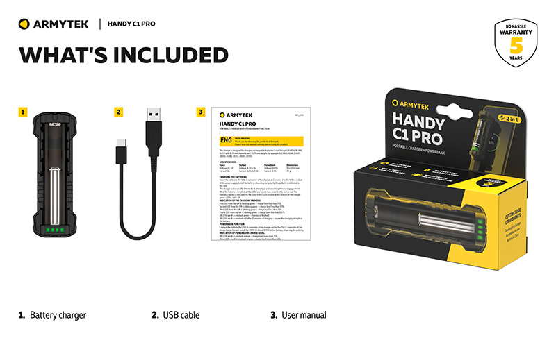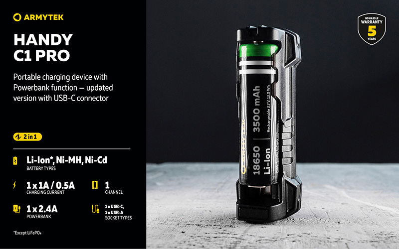 Chargeur Universel Armytek Handy C1 Pro USB-C - 2 en 1 - Powerbank - Li-Ion et Ni-MH