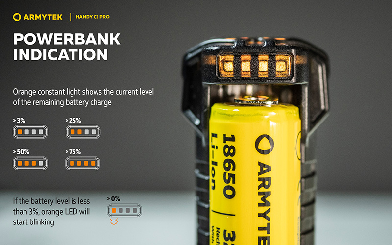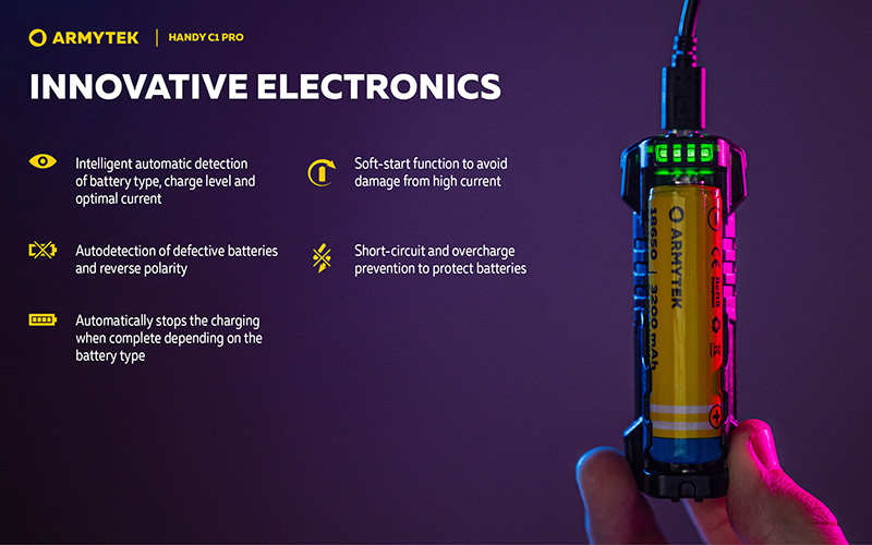 Le chargeur universel Armytek Handy C1 Pro USB-C est un chargeur portable 2 en 1 ultra compact permettant la recharge intelligente d'une batterie et la fonction Powerbank pour recharger n'importe quel périphérique. Conçu pour ceux qui apprécient la praticité, ce modèle charge automatiquement les batteries de tailles populaires, détermine le courant requis et garantit la sécurité du processus de charge, ce qui le rend idéal pour les utilisateurs nomades et les professionnels.