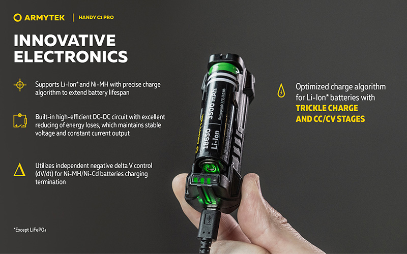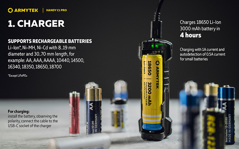 Ce chargeur universel équipé d'un connecteur USB-C se distingue par sa détection automatique intelligente du type de batterie, du niveau de charge et du courant optimal. Contrairement aux Powerbanks modernes dont la capacité est fixe, le Handy C1 Pro offre une capacité pratiquement illimitée : il suffit de remplacer la batterie 18650 Li-Ion ou 18700 Li-Ion déchargée pour continuer à l'utiliser.