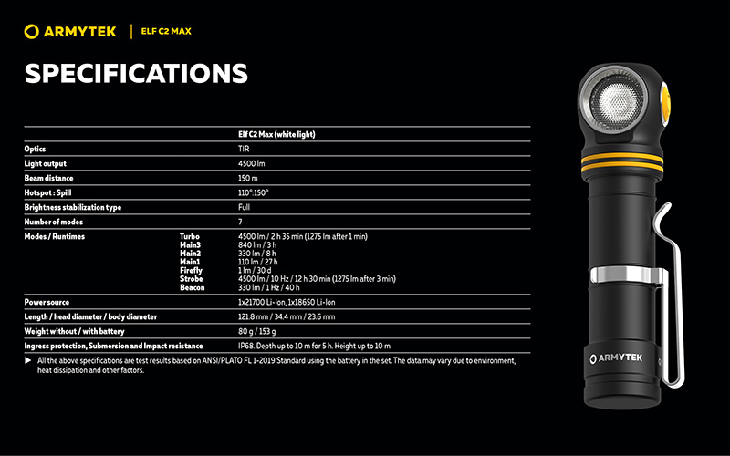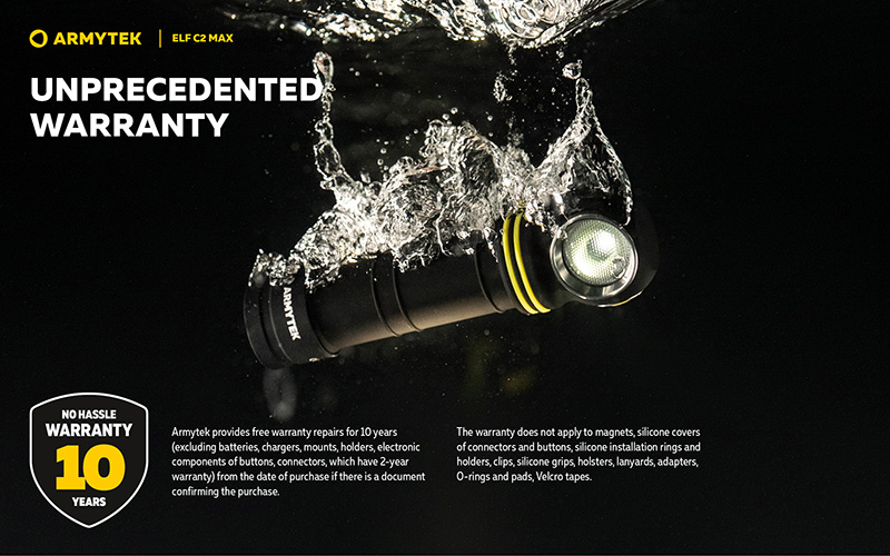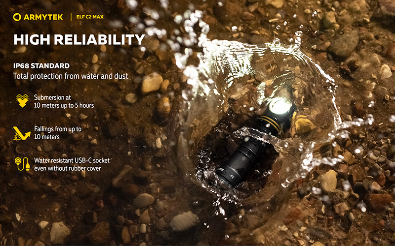 Conçue pour une utilisation polyvalente maximale, la Elf C2 Max est fabriquée en aluminium aéronautique léger et durable et bénéficie d'une protection IP68 contre l'eau jusqu'à 10 mètres de profondeur pendant 5 heures ainsi qu'une résistance aux chutes de 10 mètres. Son système optique spécialement conçu avec lentille TIR assure un faisceau large confortable sans scintillement.