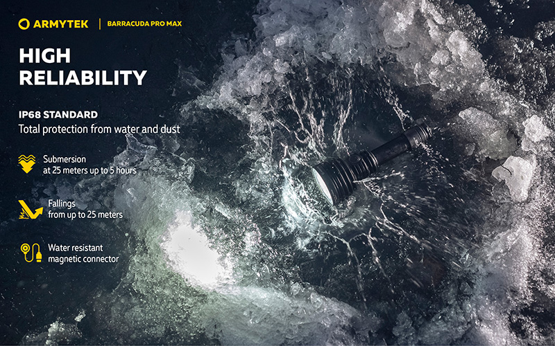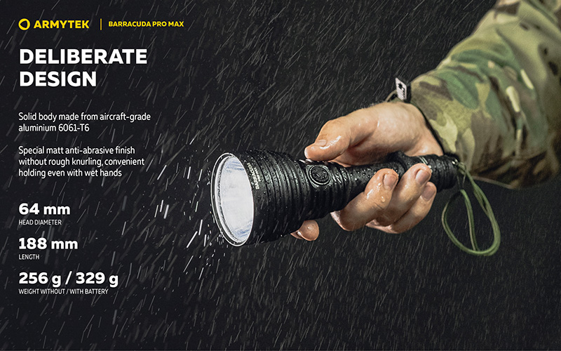 Conçue pour les environnements extrêmes, la Barracuda Pro Max est fabriquée en aluminium de grade aéronautique avec finition mate anti-abrasion et bénéficie d'une protection IP68 contre l'eau, la poussière et les chocs avec une résistance à l'immersion jusqu'à 25 mètres de profondeur pendant 5 heures. Son corps de diamètre standard 1 pouce (25,4mm) assure une compatibilité avec les supports d'armes et accessoires tactiques.