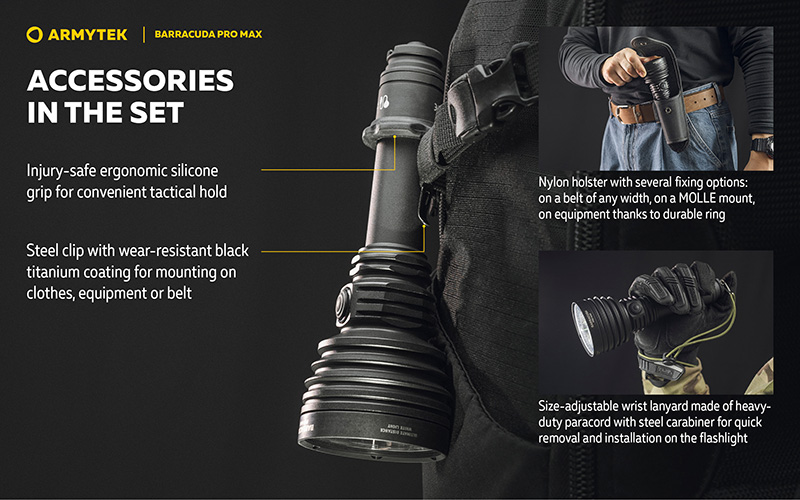 Particulièrement ergonomique, la Barracuda Pro Max inclut une double commande avec bouton tactique électronique biphasé silencieux pour un accès instantané aux fonctions principales. Son faisceau à point central distinct de 7 mètres de diamètre à 100 mètres facilite l'identification d'objets distants. Robuste et compacte avec seulement 325 grammes avec batterie, cette lampe tactique résiste aux chutes depuis 25 mètres de hauteur et aux reculs d'armes grâce à ses ressorts renforcés.