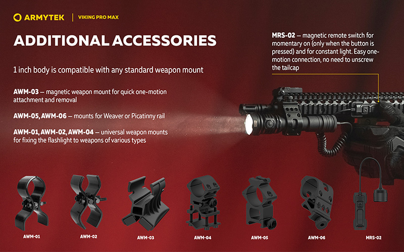 - Compatibilité : Corps standard 1 pouce compatible avec accessoires tactiques, compatible avec interrupteur déporté magnétique (optionnel)