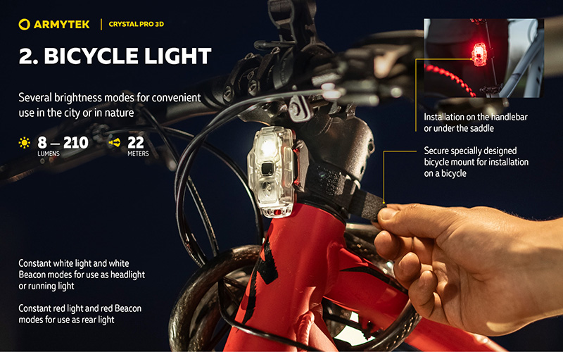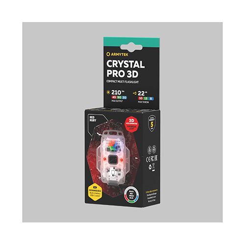 La lampe frontale Armytek Crystal Pro 3D est une lampe multifonction compacte 7 en 1 offrant 210 lumens et une portée de 22 mètres. Équipée d'un accéléromètre 3D intégré et de 3 LEDs rouges pour la fonction feu de freinage, ce qui la rend idéale pour le cyclisme et les activités outdoor.