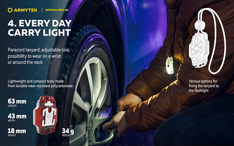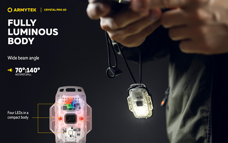 Particulièrement polyvalente, la Crystal Pro 3D inclut un support vélo sécurisé pour l'installation sur guidon. Son corps entièrement lumineux unique facilite la localisation dans l'obscurité. Compacte et légère avec seulement 24 grammes, cette lampe multifonction s'adapte à tous les usages : frontale, vélo, EDC, porte-clés, lampe de camping, signal et éclairage de secours.