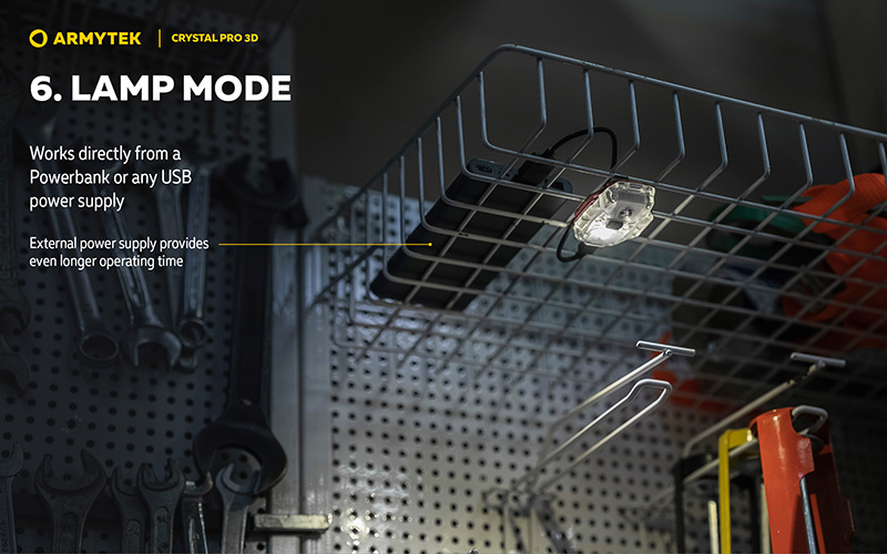 Mode lampe alimentée en continu : La Crystal Pro 3D peut fonctionner directement depuis une source USB