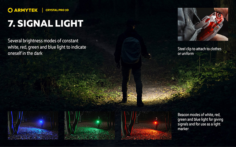 La lampe propose 7 modes d'éclairage adaptés à toutes les situations : modes Blanc pour l'éclairage principal, modes Rouge pour la vision nocturne et le feu arrière de vélo, modes Vert pour la navigation et l'observation de la faune, et modes Bleu pour la lecture de cartes. Sa conception optique optimisée maximise le faisceau large pour une utilisation à courte distance, tandis que son clip en acier permet une fixation sécurisée sur vêtements ou uniforme.