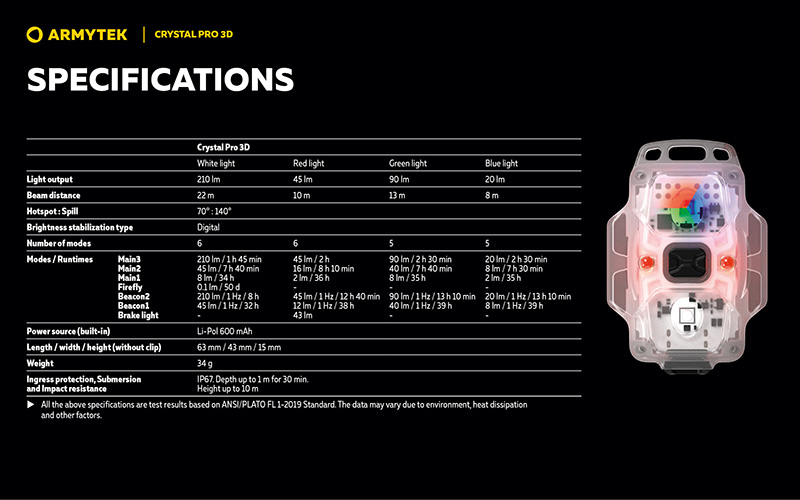 Conçue pour les activités outdoor et le cyclisme, la Crystal Pro 3D est fabriquée en plastique robuste avec corps entièrement lumineux et bénéficie d'une protection IP67 contre la poussière et l'immersion jusqu'à 1 mètre pendant 30 minutes ainsi qu'une résistance aux chutes jusqu'à 10 mètres. Son bandeau élastique souple assure un confort optimal en utilisation frontale.