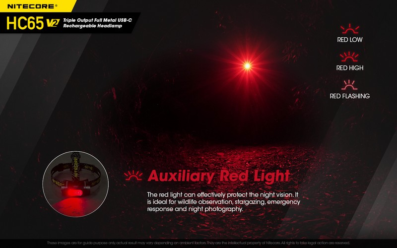 La frontale HC65V2 est équipé d’une LED Principale Blanche de 1750 Lumens mais également d’une LED auxiliaire Rouge de 11 Lumens et une LED auxiliaire Blanche avec un rendu des couleurs supérieur à 90 d’une puissance de 35 Lumens.