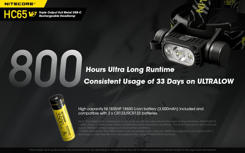 La lampe est équipé d’origine d’une batterie Nitecore NL1835HP de 3500mAh permettant un fonctionnement optimal de la lampe. Pour un bon fonctionnement à pleine puissance il sera nécessaire d’avoir un courant de décharge de 8A constant minimum. Le mode Turbo n’est pas accessible lorsque vous utilisez des piles CR123.