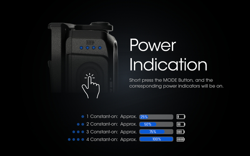 Indicateur de niveau de batterie : Quand la lampe est éteinte, appuyez brièvement sur le bouton mode pour activer l’indicateur de niveau de batterie pendant 2 secondes.