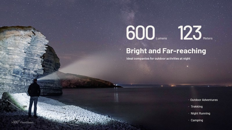 600 lumens et une portée de 123 mètres, elle offre plusieurs modes d'éclairage (primaire blanc avec jusqu'à 5 niveaux, lumière rouge auxiliaire, mode SOS et balise).