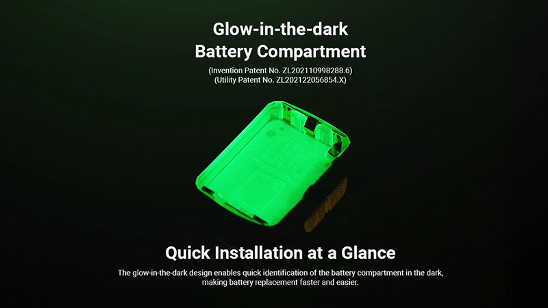 Son compartiment interne est phosphorescent et vous permet de changer la batterie en pleine nuit de manière efficace.