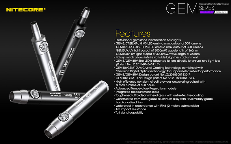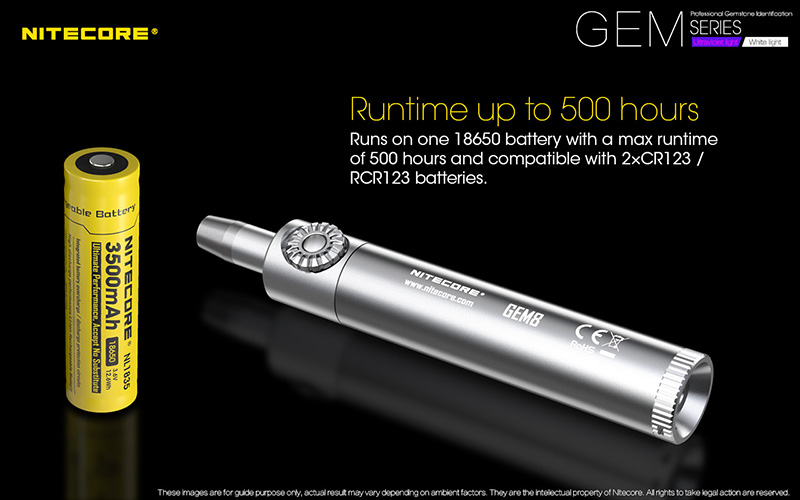 Alimentée par 1x batterie 18650 rechargeable ou 2x piles CR123, la GEM8 est l'outil d'éclairage idéal pour gemmologues, joailliers et experts en minéralogie exigeant un équipement précis, fiable et performant.