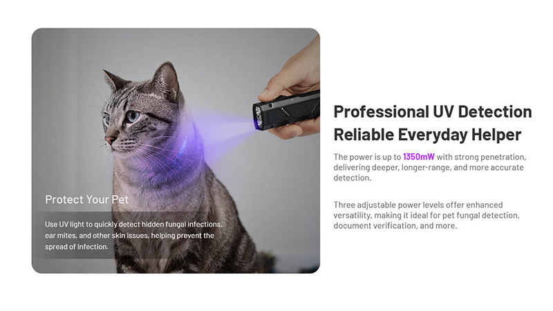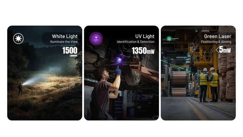 La lampe propose trois fonctions distinctes adaptées à toutes les situations : lumière blanche avec 4 niveaux de luminosité (High, Mid, Low, Ultralow) pour l'éclairage général et la navigation, lumière UV avec 3 niveaux de puissance pour l'authentification de devises, le contrôle d'accès, la détection de taches, fluides corporels ou l'identification de minéraux, et laser vert de pointage pour les présentations, l'arpentage ou le pointage longue distance. Son interrupteur coulissant trois positions optimise l'accès rapide aux fonctions, tandis que son bouton de mode permet une sélection précise des niveaux.