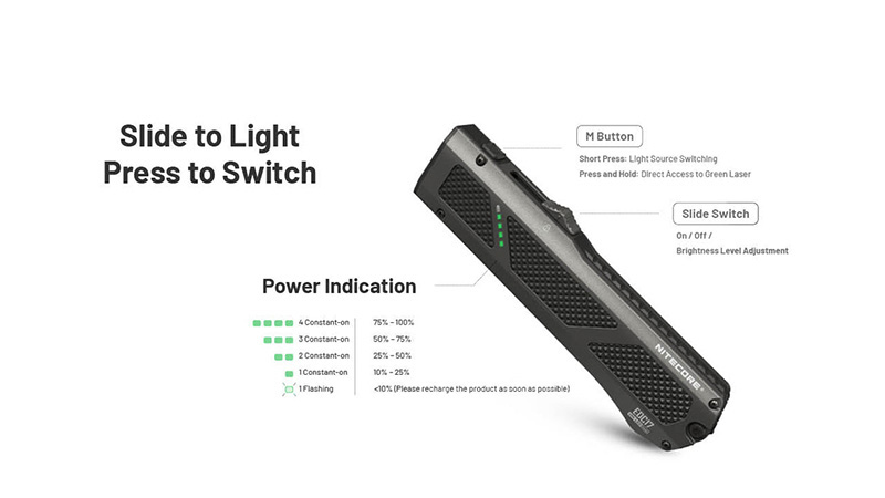 Lorsque la lumière blanche est allumée, maintenez le bouton M enfoncé pour allumer simultanément la lumière blanche et le laser vert. Relâchez le bouton pour éteindre le laser vert.