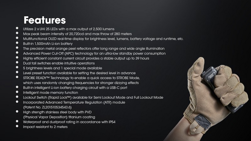 Ultra compacte avec seulement 13.5mm d’épaisseur, elle dispose de 5 niveaux de luminosité et du mode strobe aveuglant de 2500 lumens avec un accès direct, particulièrement utile dans les situations tactiques ou de self défense.