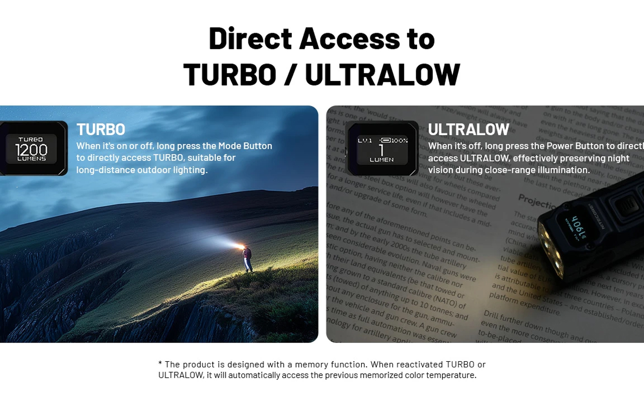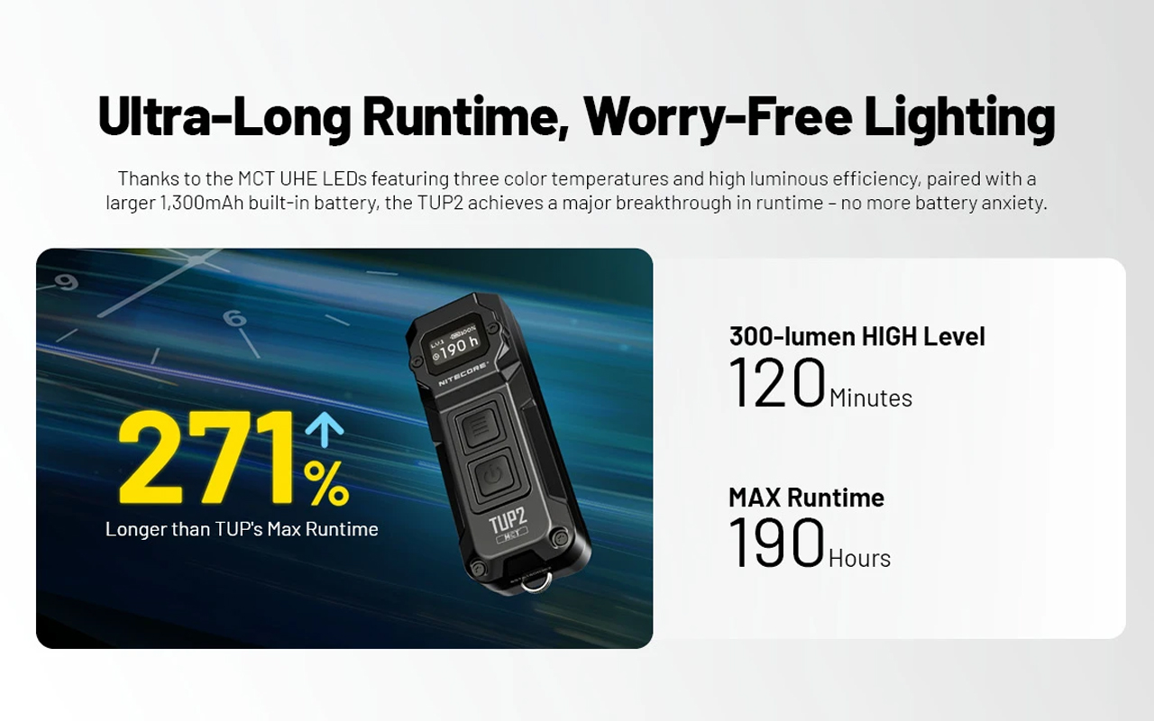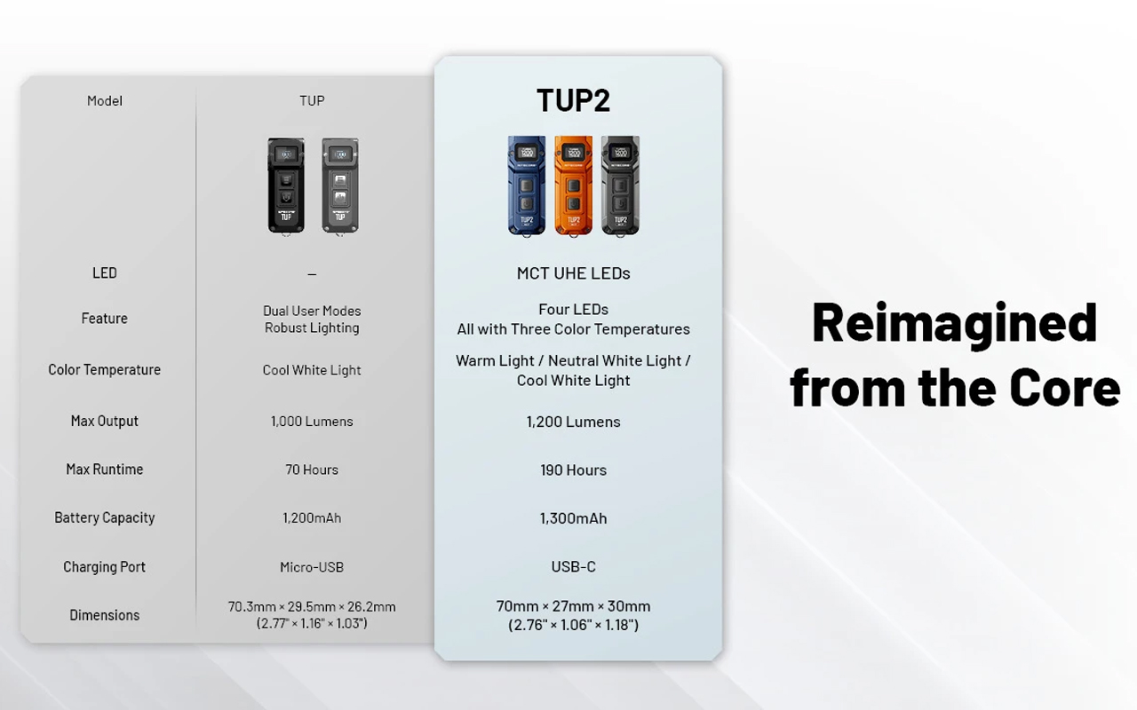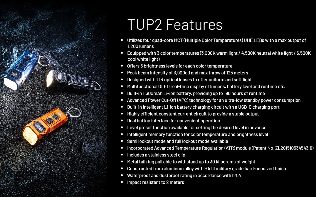Nouvelle version améliorée de la célèbre lampe porte-clés Nitecore TUP, la TUP 2 gagne en puissance et en polyvalence. Équipée de quatre LED MCT UHE développées par NiteLab, elle délivre jusqu’à 1200 Lumens pour une portée maximale de 125 mètres. Son innovation majeure : un système à trois températures de couleur – chaude (3500 K), neutre (4500 K) et froide (6500 K) – offrant un éclairage parfaitement adapté à chaque situation.