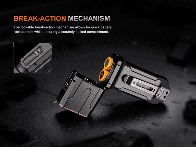 Cette lampe robuste et polyvalente se distingue par son système de chargement break-action permettant un remplacement rapide des batteries, et son double interrupteur arrière pour un accès instantané aux modes Turbo, Stroboscope et lumière rouge clignotante. Les deux batteries Fenix ARB-L18-4000 de 4000mAh incluses offrent une autonomie allant jusqu'à 102 heures selon le mode d'utilisation.
