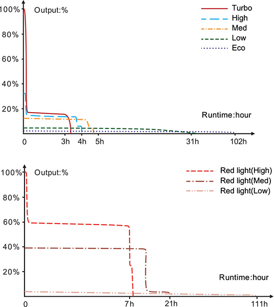 - Mode Eco : 30 Lumens, 102h, portée 27 mètres, 190cd