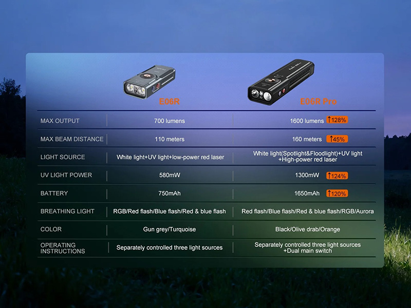 Rechargeable via port USB Type-C avec protection contre la poussière et l'eau, la E06R Pro est l'outil d'éclairage idéal pour les professionnels, aventuriers outdoor et utilisateurs EDC exigeant un équipement fiable, innovant et performant.