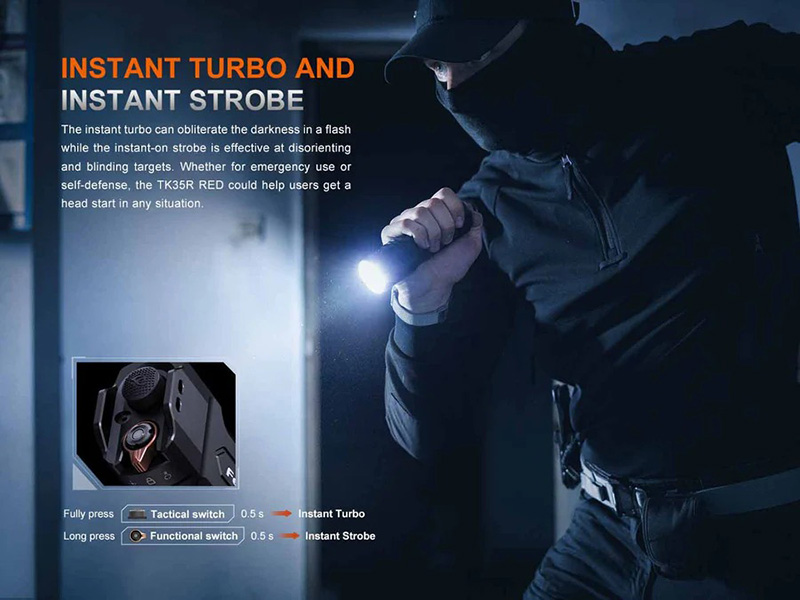 Conçue pour les environnements les plus exigeants, la TK35R RED est fabriquée en alliage d'aluminium haute résistance et bénéficie d'une protection IP68 contre l'immersion jusqu'à 2 mètres ainsi qu'une résistance aux chutes de 1 mètre. Son système de double interrupteur tactique silencieux assure une activation discrète et instantanée en situations critiques.