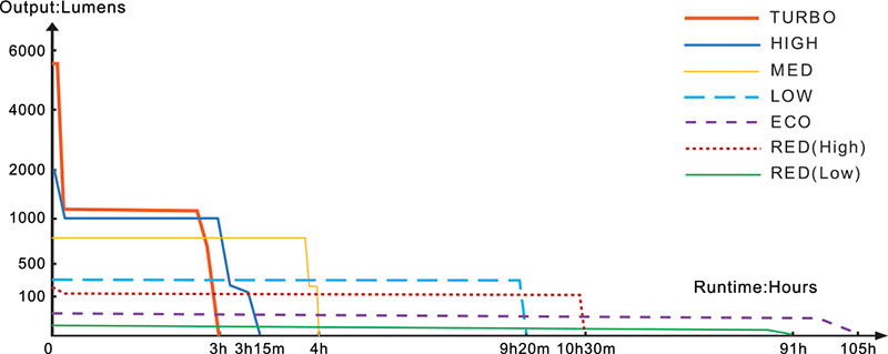 - Mode Turbo : 5800 Lumens, 3h, portée 610 mètres, 93000cd
