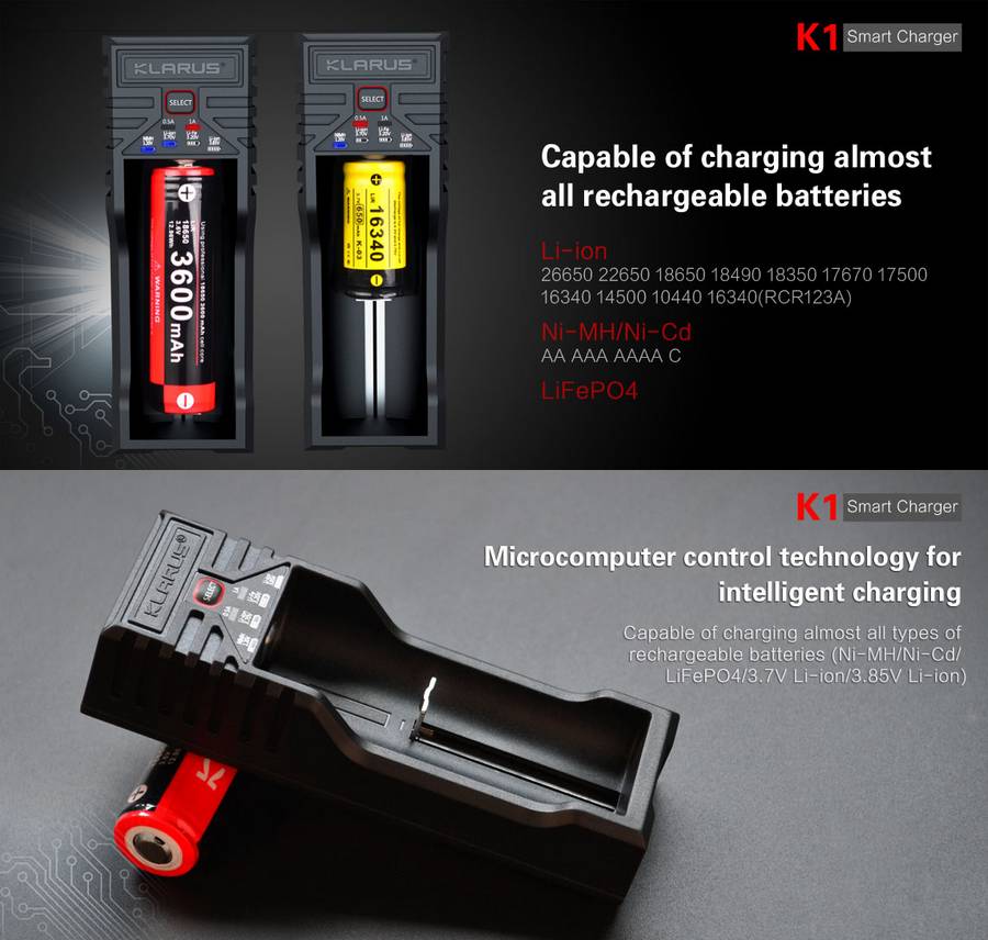 Chargeur Klarus K1 USB pour batterie Li-ion, Ni-MH, Ni-Cd et LiFePO4