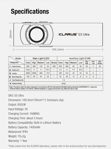 Lampe de travail compacte, lampe de voyage Klarus E5 800 Lumens - 11 modes d'éclairage régulés - Utilise 1 batterie intégrée 1400mAh - Autonomie max de 16.5h à 30 Lumens - Etanche IPX5 - Portée de 120 mètres