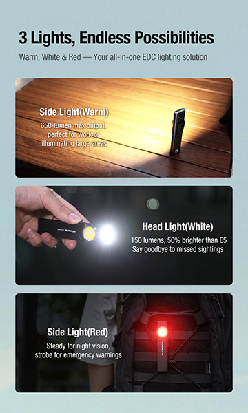 Particulièrement polyvalente, la E5 Plus inclut une base magnétique puissante pour un éclairage mains libres et un clip robuste pour usage en lampe d'angle droit. Son ergonomie améliorée présente des interrupteurs positionnés 8mm plus haut que l'E5 original pour une facilité d'utilisation accrue. Ultra-compacte avec seulement 39 grammes, cette lampe de travail combine performance et portabilité.