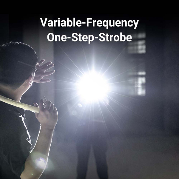 - Pression complète sur l'interrupteur arrière : activation instantanée du stroboscope 3500 lumens (One-Step-Strobe)