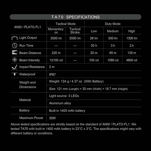 Conçue pour les opérateurs tactiques, les patrouilles, les professionnels de l'outdoor et les services d'urgence, la TA70 est fabriquée en aluminium aéronautique de qualité militaire et bénéficie d'une protection IP67 contre l'eau et la poussière ainsi qu'une résistance aux chocs de 2 mètres. Son corps monobloc ultra-compact assure une prise en main naturelle et un transport discret en poche ou sur équipement MOLLE.