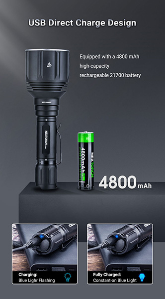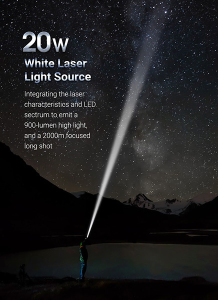 Cette lampe laser équipée d'une source laser blanc se distingue par sa distance de faisceau impressionnante et son commutateur tactique multifonction, permettant de basculer facilement entre 6 modes pour répondre à différents besoins d'éclairage. La batterie 21700 Li-Ion 4800mAh offre une autonomie allant jusqu'à 6 heures selon le mode d'utilisation.
