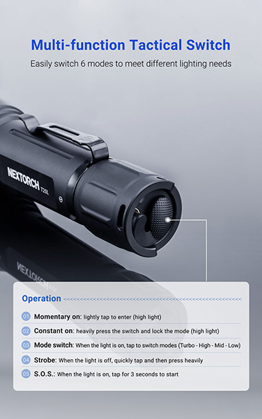 Rechargeable rapidement via port USB-C, la T20L est l'outil d'éclairage idéal pour les professionnels tactiques, forces de l'ordre, agents de sécurité et passionnés d'activités de plein air exigeant un éclairage puissant à ultra longue portée.