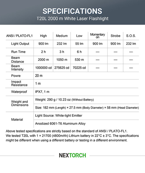 La lampe torche laser Nextorch T20L est une lampe tactique haute performance à ultra longue portée offrant 900 lumens et une portée exceptionnelle de 2000 mètres. Dotée d'un émetteur White Light Emitter, elle est conçue pour répondre aux besoins rigoureux des professionnels tactiques, agents des forces de l'ordre et passionnés de plein air.