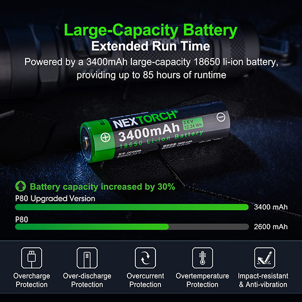 Cette lampe Nextorch P80 est alimentée par une batterie 18650 3400 mAh pour une autonomie de 85 heures max dans le mode à 25 Lumens.