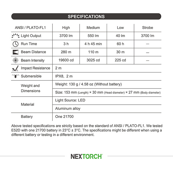 La lampe torche Nextorch E52D est une lampe de poche rechargeable EDC tactique qui offre 3700 Lumens pour une portée de 280 mètres. Elle est alimentée par une batterie 21700 de 4800 mAh qui se recharge en environ 5 heures grâce à son port USB-C intégré.