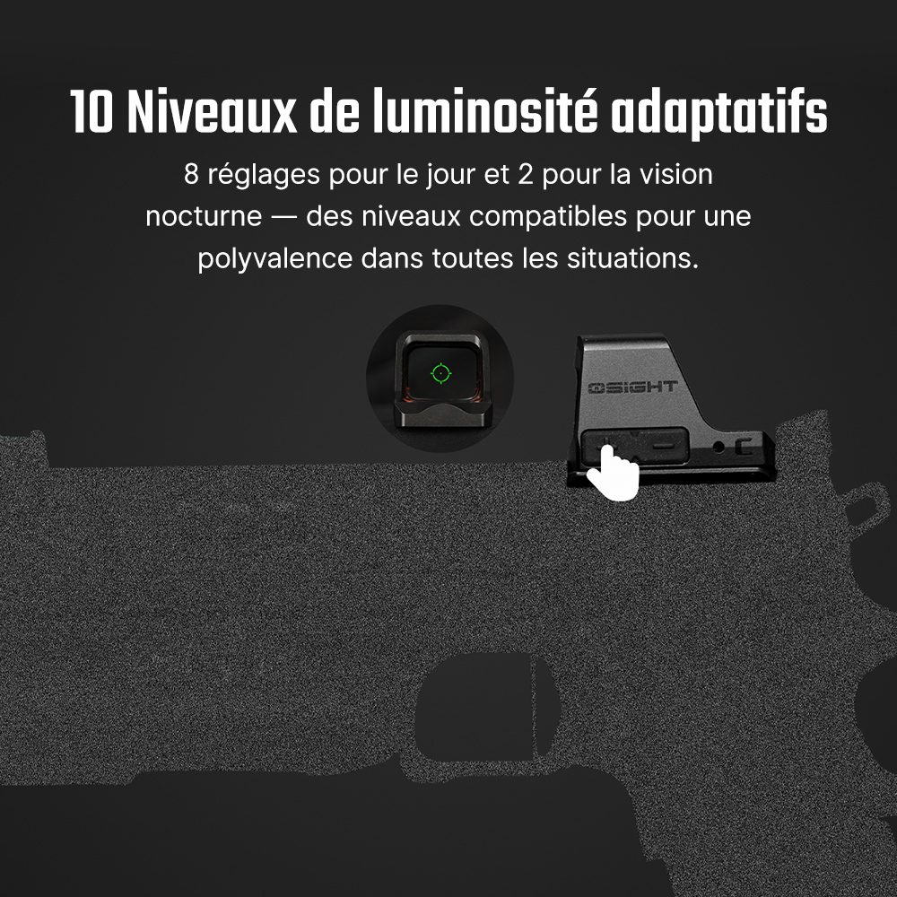 Particulièrement polyvalente, l'OSight C inclut une fonction mémoire pour mémoriser vos réglages préférés. Son empreinte Reflex Miniature Renforcée (RMR) facilite l'installation sur de nombreux pistolets compacts et de taille standard. Ultra-compacte avec seulement 42 grammes, cette optique offre une solution de visée professionnelle.