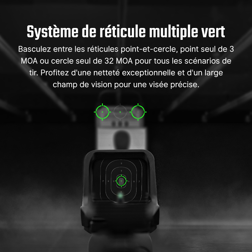 L'optique propose 3 configurations de réticule adaptées à toutes les situations : mode point uniquement pour la précision à distance, mode cercle uniquement pour l'acquisition rapide, et mode point-et-cercle combiné pour une polyvalence maximale. Sa plage de réglage de ± 45 MOA optimise l'ajustement en dérive et élévation, tandis que son ajustement de 1 MOA par clic permet un réglage précis.