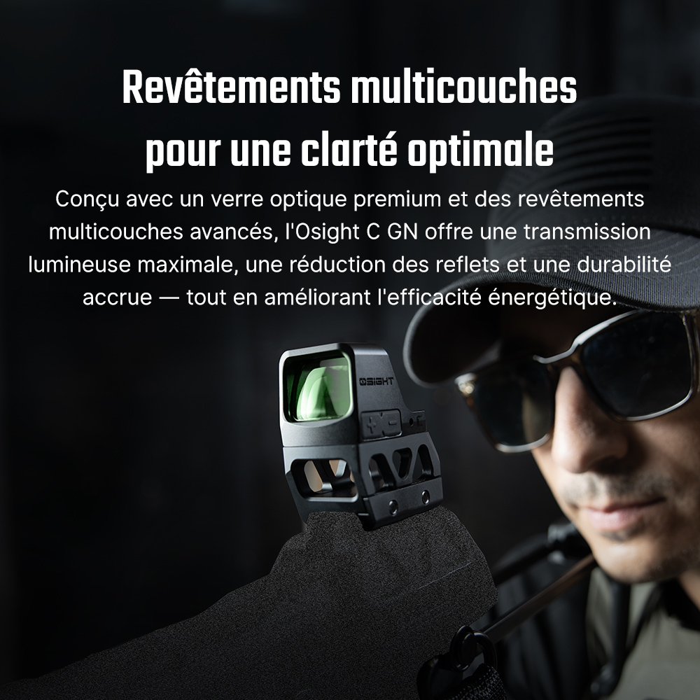 Conçue pour le tir tactique et sportif, l'OSight C est fabriquée en alliage d'aluminium 7075-T6 haute résistance et bénéficie d'une protection IPX6 contre l'humidité et les projections d'eau ainsi qu'une résistance aux températures extrêmes de -30°C à 60°C. Sa fonction capteur de mouvement assure une activation automatique au moindre déplacement.