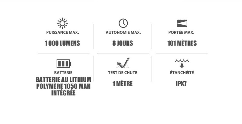 Lumière Blanche Améliorée : fournissant une luminosité maximale impressionnante de 1000 lumens pour un excellent éclairage.