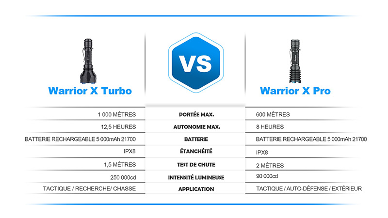 Conçue pour les environnements tactiques exigeants, la Warrior X Turbo est fabriquée en aluminium haute résistance et bénéficie d'une protection IPX8 contre l'immersion prolongée ainsi qu'une construction renforcée. Son design compact de 157mm assure une prise en main ferme et un transport discret.