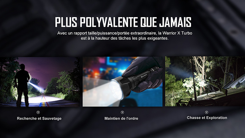 Rechargeable via câble de charge magnétique MCC3 avec un courant de 2A, la Warrior X Turbo est l'outil d'éclairage idéal pour les forces de l'ordre, les unités tactiques, les chasseurs, les équipes de recherche et sauvetage et les passionnés d'activités outdoor exigeant un équipement puissant, fiable et professionnel.