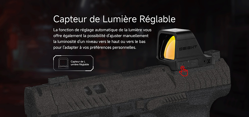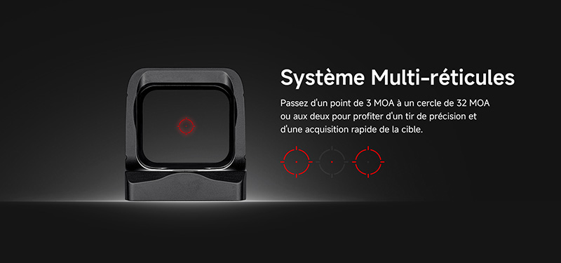 L'optique propose trois configurations de réticule adaptées à toutes les situations de tir : réticule point et cercle pour une acquisition rapide, point uniquement pour le tir de précision, et cercle uniquement pour l'engagement rapproché. Sa lentille multicouche antireflet optimise la transmission lumineuse, tandis que son capteur de mouvement intelligent permet une activation instantanée.