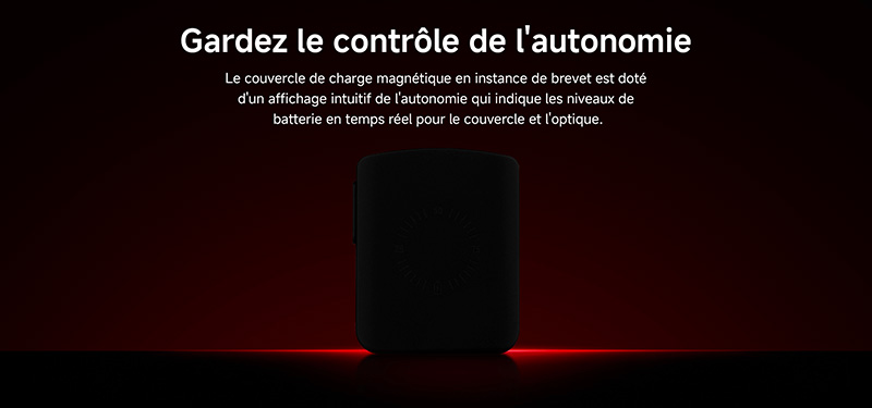 Pour changer de configuration de réticule, utilisez les boutons latéraux de réglage. L'affichage du couvercle de charge indique les niveaux de batterie : en temps réel pour l'optique et le couvercle.