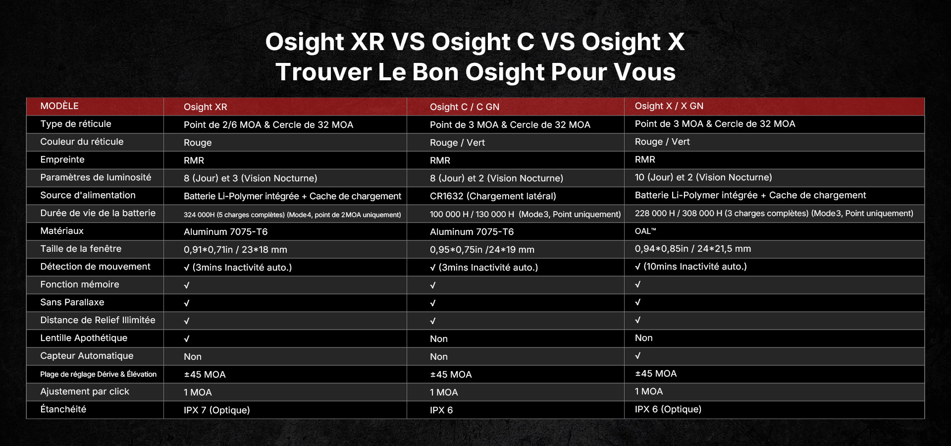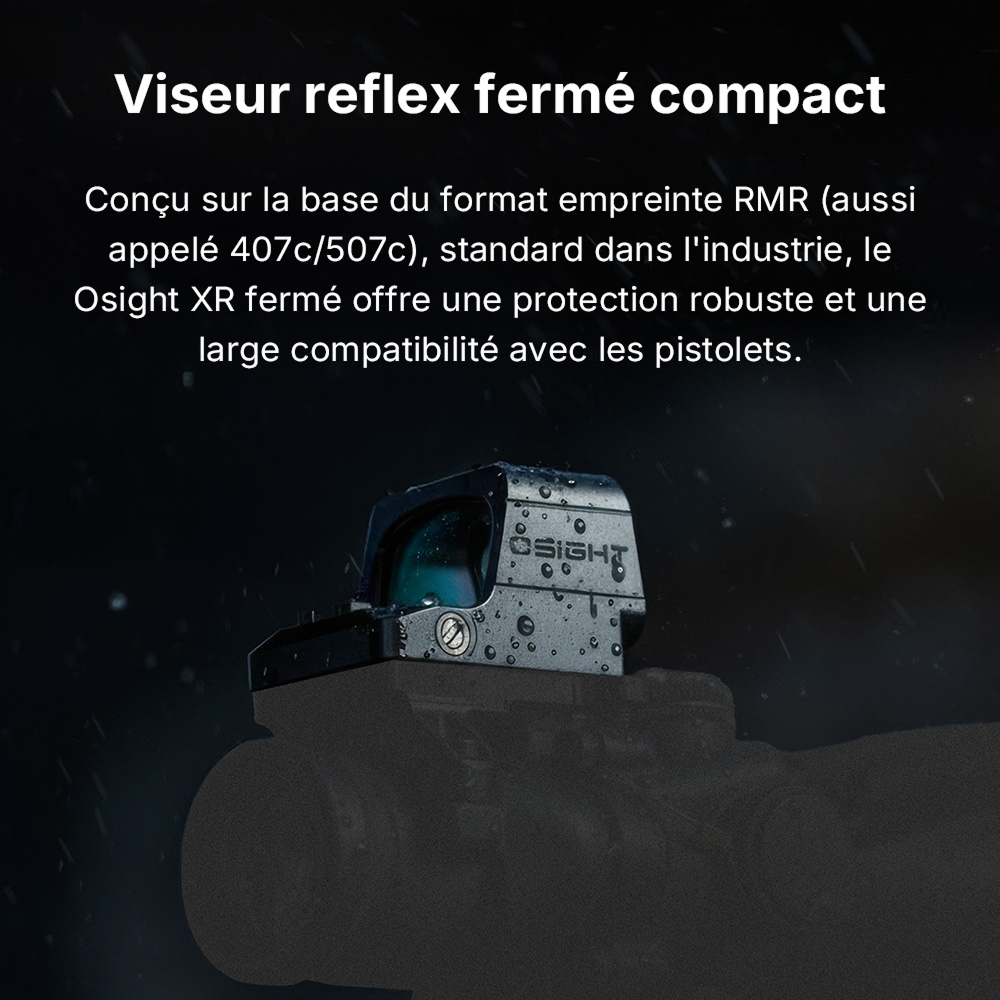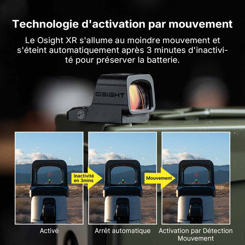 Avec son boîtier compact en aluminium 7075-T6, sa lentille asphérique sans distorsion et son activation par mouvement, la Osight XR est conçue pour un usage intensif. Le champ de vision élargi et la clarté optique renforcent la rapidité de prise de visée et le confort visuel, même dans des conditions exigeantes.